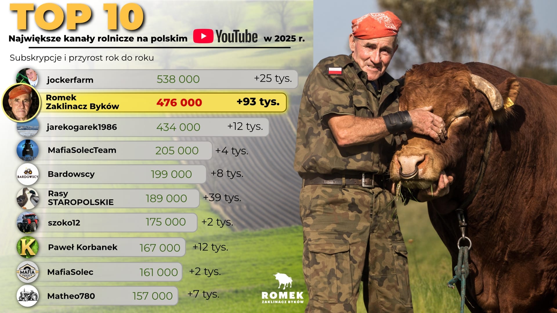 W zestawieniu największych polskich kanałów rolniczych na YouTube w 2025 roku Romek Zaklinacz Byków zajął drugie miejsce pod względem liczby subskrybentów i dynamiki wzrostu.